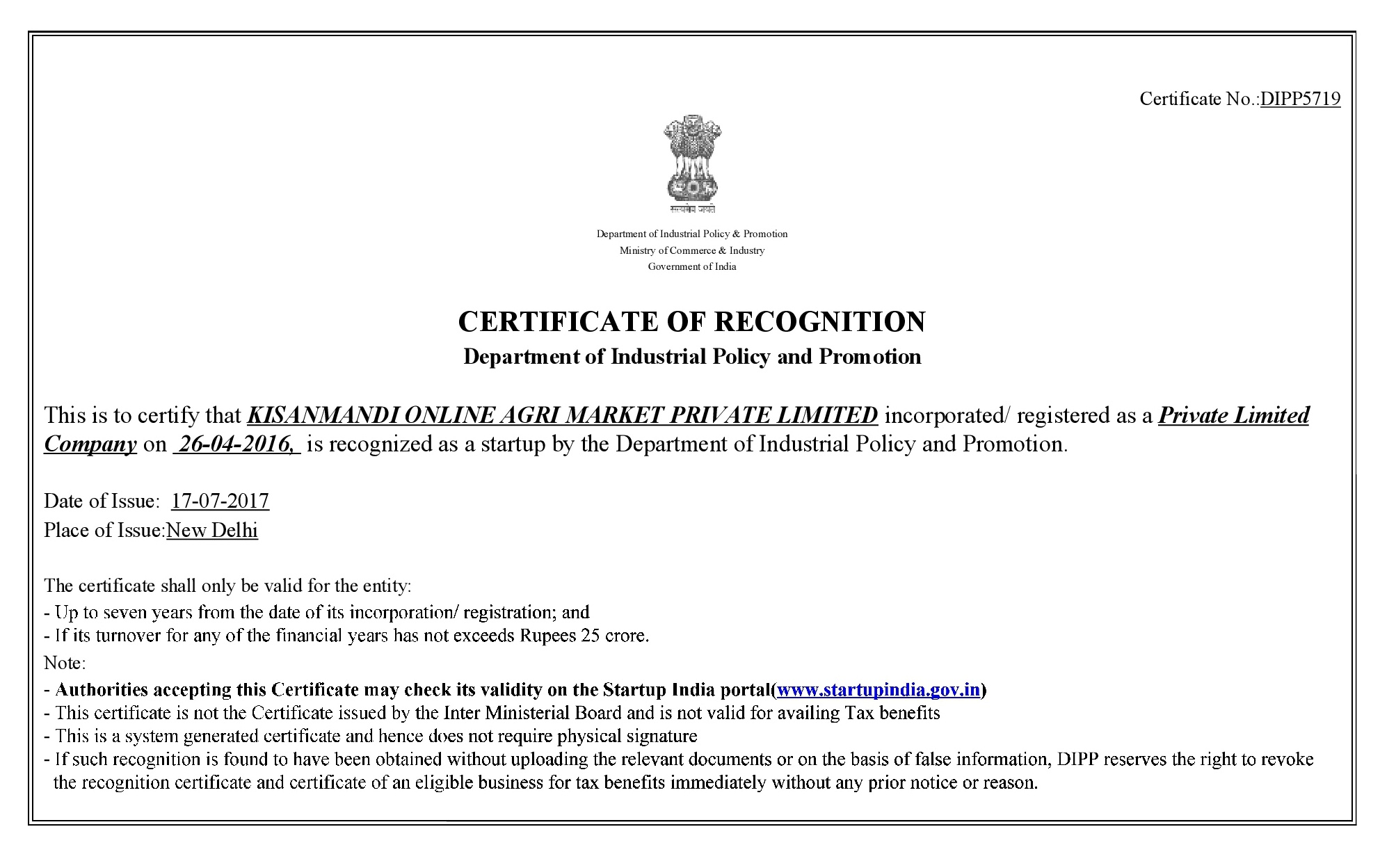 This is to certify that KISANMANDI ONLINE AGRI MARKET PRIVATE LIMITED is an agri startup and incorporated/ registered as a Private Limited Company on 26-04-2016, is recognized as a startup by the Department of Industrial Policy and Promotion, Govt. of India.